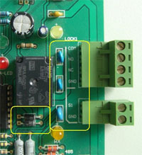 如果設(shè)置完畢后,出現(xiàn)以下異常:門開了一半就馬上關(guān)閉了,或者 關(guān)了一半又打開了。 這個(gè)是因?yàn)椋刂破骼^電器對電鎖保護(hù)電路對自動門有副作用,請拆除或者剪斷繼電器旁邊的黑色的二極管。剪斷每個(gè)元件的一個(gè)管腳并翹起即可。(藍(lán)色的壓敏保護(hù)電路不用動)