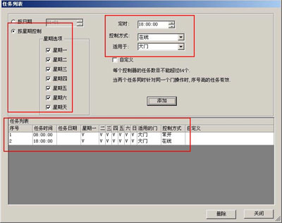 進(jìn)行定時(shí)任務(wù)設(shè)置,添加兩個(gè)定時(shí)任務(wù),設(shè)置完畢后 到 [總控制臺] 上傳設(shè)置,注意上傳完畢后,由于還沒有到啟動定時(shí)任務(wù)的時(shí)間,所以門的系統(tǒng)還是保持在線狀態(tài).
